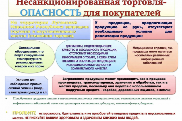 Приобретая продукцию в местах несанкционированной уличной торговли, потребитель подвергает себя большому риску, продукты хранятся и реализуются в антисанитарных условиях и без соблюдения надлежащего температурного режима, отсутствуют документы, удостоверяющие качество и безопасность реализуемой продукции.